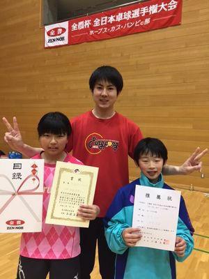 全日本卓球選手権ホカバの部 東京都予選 2017年04月09日(日) 全日本卓球選手権、ホカバの部東京都予選に出場しました! ホープス男子 準優勝 二井原選手(小6) ホープス女子 優勝 小林選手(小6) 二名が7月に開催される全日本卓球選手権大会代表を決めました! 二人にとって最後のホカバ東京都予選、最終学年で最高の結果で通過してくれた二人の頑張りに感謝します! 年々厳しくなる予選会ですが、今日の先輩の姿を目に焼き付けて、5年生以下の選手も来年に向けて頑張ってください。