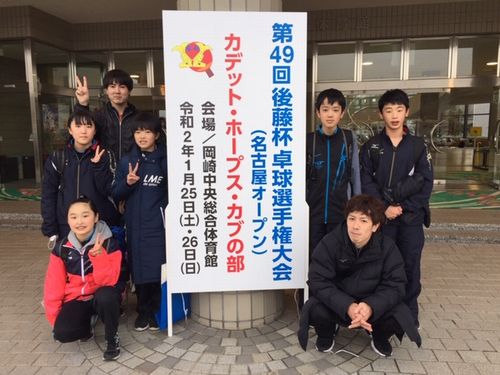 後藤杯卓球選手権大会(名古屋オープン)に出場しました! 2020年01月27日(月) 1月25、26日、後藤杯に6名で出場しました。 全国オープンの厳しい試合でしたが、女子カブで準優勝と健闘しました! ご父兄の皆さま、先生方、遠方まで引率ありがとうございました! ●男子カデット 二井原選手 決勝トーナメント2回戦 ●男子ホープス 福井選手 決勝トーナメント2回戦 ●女子カデット 百崎選手 決勝トーナメント1回戦 中村選手 予選リーグ1勝1敗 ●女子ホープス 梅澤選手 決勝トーナメント2回戦 ●女子カブ 藤本選手 準優勝