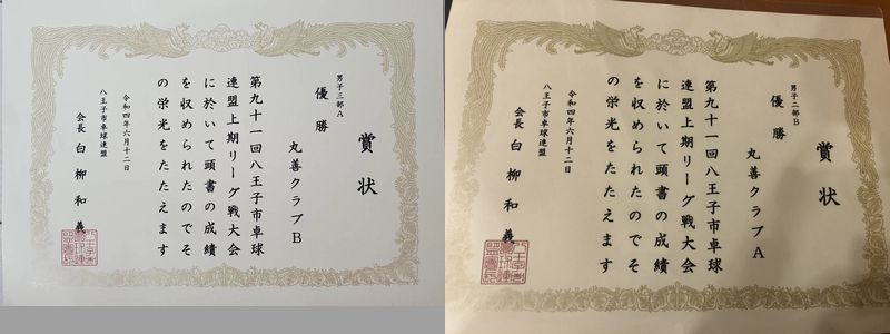 八王子市上期リーグ戦に出場しました! 2022年06月13日(月) 6月12日、八王子市上期リーグ戦に出場しました! 丸善クラブA(原口・梅澤・富澤・橋本) 丸善クラブB(岩崎・中村・加藤・平尾) ともに優勝することができました! 出場いただいた選手の皆様、お忙しい中ご参加ありがとうございました。