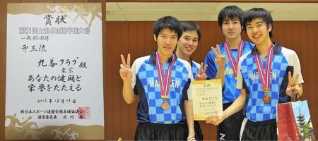 新体連全国卓球選手権大会 男子団体戦 第三位! 2015年12月25日(金) 京都府で12月19・20日全国卓球選手権大会が開催されました! 丸善クラブの若手が第三位と健闘しました、選手の皆さまおめでとうございました! 男子団体戦準決勝 丸善クラブ 1-3 WRM